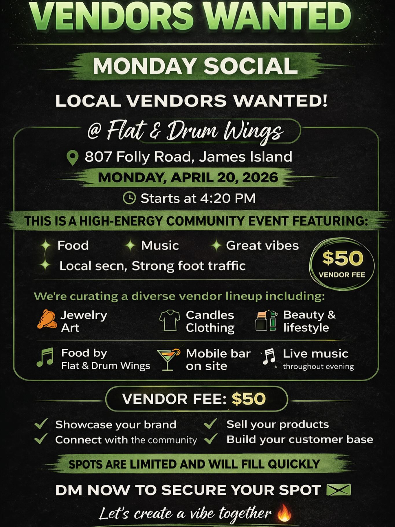Flat and Drum Wings is a fast-casual restaurant located on James Island in Charleston, South Carolina, specializing in authentic, flavor-packed chicken wings served in both traditional and boneless styles. Our concept celebrates the classic debate of “flats vs. drums” by offering a wide variety of signature sauces, dry rubs, and specialty flavors inspired by Southern, Caribbean, African, and global cuisines.